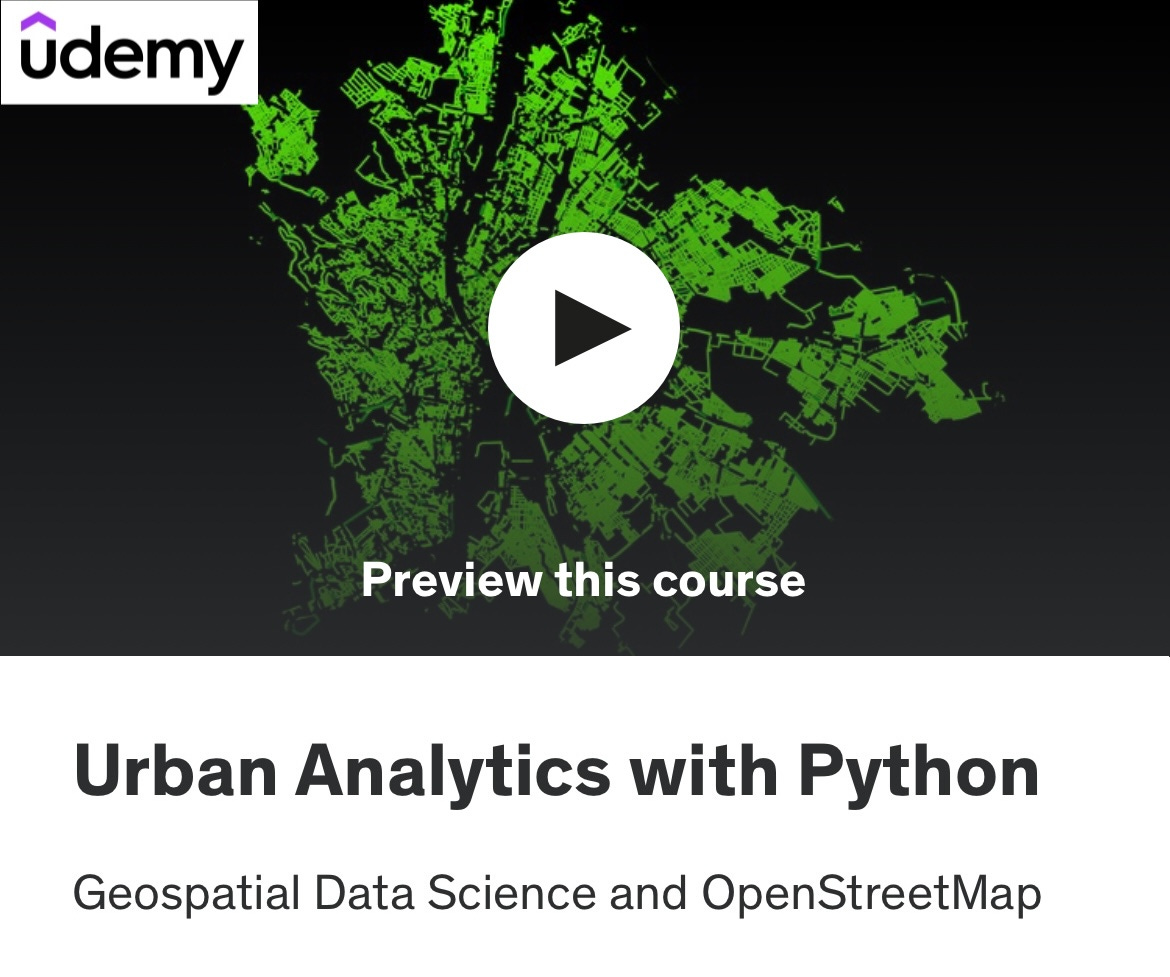Urban Analytics with PythonGeospatial Data Science and OpenStreetMapMilan JanosovSep 18, 2024∙ Paid2ShareSign-up here on Udemy! Watch the video intro on YouTube:This post is for paid subscribersSubscribeAlready a paid subscriber? Sign in